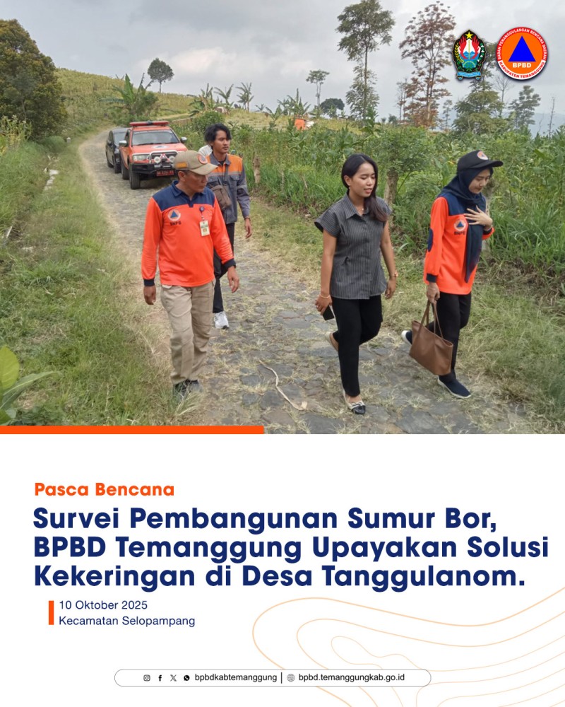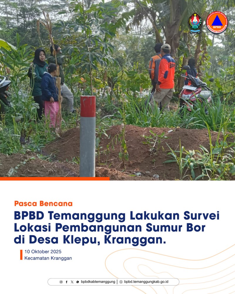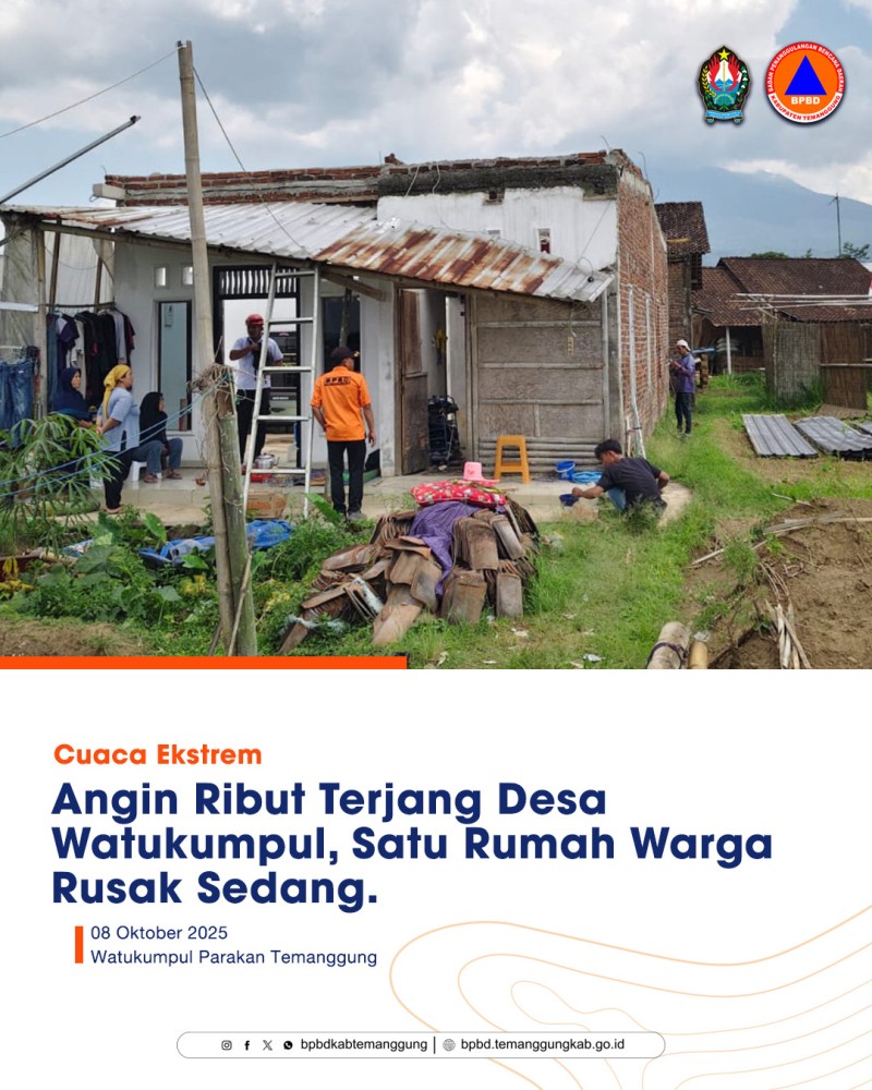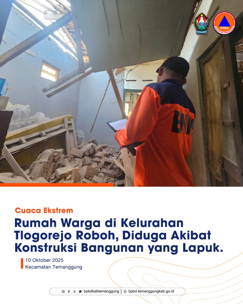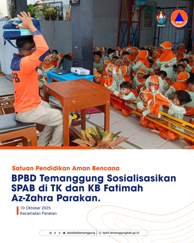 Kategori Smart Government (Pemerintah Cerdas) Kategori: Smart Government (Pemerintah Cerdas) Seksi Penanganan Darurat dan Logistik 10 Okt 2025 18:54:00 14 BPBD Temanggung Gelar Rapat Evaluasi Pusdalops untuk Tingkatkan Efektivitas Penanganan Bencana Selengkapnya Kategori: Smart Government (Pemerintah Cerdas) Sekretariat 10 Okt 2025 18:51:00 23 BNPB dan Lembaga Pendidikan Bahas Ancaman Megathrust hingga Tragedi Sidoarjo dalam Seminar Kebencanaan Nasional Selengkapnya Kategori: Smart Government (Pemerintah Cerdas) Seksi Rehabilitasi dan Rekontruksi 10 Okt 2025 17:36:00 14 BPBD Temanggung Lakukan Survei Lokasi Pembangunan Sumur Bor di Desa Klepu, Kecamatan Kranggan Selengkapnya Kategori: Smart Government (Pemerintah Cerdas) Seksi Rehabilitasi dan Rekontruksi 10 Okt 2025 14:33:00 18 Survei Pembangunan Sumur Bor, BPBD Temanggung Upayakan Solusi Kekeringan di Desa Tanggulanom Selengkapnya Kategori: Smart Government (Pemerintah Cerdas) Seksi Pencegahan dan Kesiapsiagaan 10 Okt 2025 12:58:00 23 LAPORAN AKTIVITAS GUNUNGAPI SUMBING 9 OKTOBER 2025 Selengkapnya Kategori: Smart Government (Pemerintah Cerdas) Seksi Pencegahan dan Kesiapsiagaan 10 Okt 2025 11:57:00 27 LAPORAN AKTIVITAS GUNUNGAPI SUNDORO 09 OKTOBER 2025 Selengkapnya Kategori: Smart Government (Pemerintah Cerdas) Sekretariat 10 Okt 2025 09:35:00 19 Rumah Warga di Kelurahan Tlogorejo Roboh, Diduga Akibat Konstruksi Bangunan yang Lapuk Selengkapnya Kategori: Smart Government (Pemerintah Cerdas) Seksi Pencegahan dan Kesiapsiagaan 10 Okt 2025 09:32:00 21 BPBD Temanggung Sosialisasikan Satuan Pendidikan Aman Bencana di TK dan KB Fatimah Az-Zahra Parakan Selengkapnya Kategori: Smart Government (Pemerintah Cerdas) Seksi Penanganan Darurat dan Logistik 10 Okt 2025 07:23:00 15 Pohon di Depan Kodim Temanggung Patah Terserempet Truk, BPBD Lakukan Penanganan Selengkapnya Kategori: Smart Government (Pemerintah Cerdas) Sekretariat 09 Okt 2025 17:23:00 4 Personil BPBD Temanggung Ikuti Kegiatan “Sharing Experience” Pranata Pencarian dan Pertolongan yang Digelar Basarnas Selengkapnya Kategori: Smart Government (Pemerintah Cerdas) Seksi Penanganan Darurat dan Logistik 08 Okt 2025 20:45:00 67 Angin Ribut Terjang Desa Watukumpul, Satu Rumah Warga Rusak Sedang Selengkapnya Kategori: Smart Government (Pemerintah Cerdas) Seksi Pencegahan dan Kesiapsiagaan 08 Okt 2025 17:38:00 20 LAPORAN AKTIVITAS GUNUNGAPI SUNDORO 8 OKTOBER 2025 Selengkapnya 123NextLast