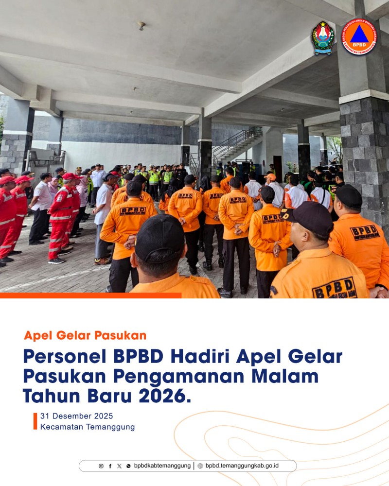 Kategori Smart Government (Pemerintah Cerdas) Kategori: Smart Government (Pemerintah Cerdas) Seksi Penanganan Darurat dan Logistik 02 Januari 2026 22:03:00 30 Tebing Longsor Timpa Rumah Warga dan Tutup Jalan Alternatif di Desa Sucen Selengkapnya Kategori: Smart Government (Pemerintah Cerdas) Sekretariat 01 Januari 2026 22:08:00 8 Sepanjang 2025, Kabupaten Temanggung Alami 50 Kejadian Bencana Selengkapnya Kategori: Smart Government (Pemerintah Cerdas) Seksi Pencegahan dan Kesiapsiagaan 01 Januari 2026 15:32:00 36 Siklon Tropis IGGY Picu Potensi Cuaca Ekstrem, Masyarakat Temanggung Diminta Waspada Selengkapnya Kategori: Smart Government (Pemerintah Cerdas) Sekretariat 01 Januari 2026 06:34:00 13 Selamat Tahun Baru 2026 Selengkapnya Kategori: Smart Government (Pemerintah Cerdas) Sekretariat 31 Desember 2025 23:59:00 18 BPBD Temanggung Lakukan Patroli Basecamp Pendakian, Pastikan SOP Keamanan Pendaki Selengkapnya Kategori: Smart Government (Pemerintah Cerdas) Seksi Pencegahan dan Kesiapsiagaan 31 Desember 2025 22:40:00 7 LAPORAN AKTIVITAS GUNUNGAPI SUNDORO BER 2025 Selengkapnya Kategori: Smart Government (Pemerintah Cerdas) Seksi Pencegahan dan Kesiapsiagaan 31 Desember 2025 21:41:00 9 LAPORAN AKTIVITAS GUNUNGAPI SUMBING 31 DESEMBER 2025 Selengkapnya Kategori: Smart Government (Pemerintah Cerdas) Sekretariat 31 Desember 2025 17:41:00 21 Personel BPBD Hadiri Apel Gelar Pasukan Pengamanan Malam Tahun Baru 2026 di City Walk Temanggung Selengkapnya Kategori: Smart Government (Pemerintah Cerdas) Sekretariat 31 Desember 2025 17:26:00 22 BPBD Pasang Tenda Pengungsi Dukung Pengamanan Malam Tahun Baru 2026 di City Walk Alun-Alun Temanggung Selengkapnya Kategori: Smart Government (Pemerintah Cerdas) Seksi Penanganan Darurat dan Logistik 31 Desember 2025 17:22:00 15 BPBD Salurkan Logistik untuk Korban Tanah Longsor di Desa Tempelsari Selengkapnya Kategori: Smart Government (Pemerintah Cerdas) Seksi Penanganan Darurat dan Logistik 31 Desember 2025 16:20:00 18 Hujan Deras Picu Longsor Tebing Rumah di Desa Tempelsari, Satu Rumah Terdampak Selengkapnya Kategori: Smart Government (Pemerintah Cerdas) Sekretariat 31 Desember 2025 09:24:00 9 Pos Pam Tugu Jam Temanggung Pastikan Keamanan dan Kelancaran Arus Lalu Lintas Nataru Selengkapnya Prev1234NextLast