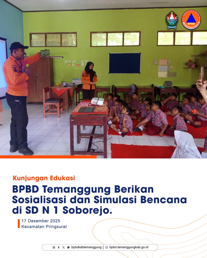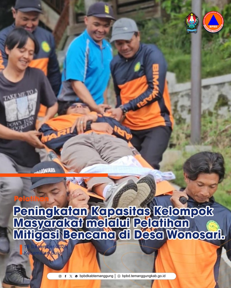 Kategori Smart Government (Pemerintah Cerdas) Kategori: Smart Government (Pemerintah Cerdas) Seksi Pencegahan dan Kesiapsiagaan 18 Desember 2025 16:47:00 1 Pelatihan Kesiapsiagaan dan Tanggap Bencana Skala Lokal Digelar di Desa Krempong Selengkapnya Kategori: Smart Government (Pemerintah Cerdas) Seksi Pencegahan dan Kesiapsiagaan 18 Desember 2025 14:07:00 1 Pelatihan Kesiapsiagaan dan Tanggap Bencana Skala Lokal Digelar di Desa Tlahap Selengkapnya Kategori: Smart Government (Pemerintah Cerdas) Seksi Pencegahan dan Kesiapsiagaan 18 Desember 2025 10:46:00 1 BPBD Jadi Narasumber Peningkatan Kapasitas Pemuda dalam Penanggulangan Bencana Selengkapnya Kategori: Smart Government (Pemerintah Cerdas) Seksi Pencegahan dan Kesiapsiagaan 18 Desember 2025 08:48:00 2 Pelatihan Mitigasi Risiko Bencana bagi Masyarakat Digelar di Desa Bejen Selengkapnya Kategori: Smart Government (Pemerintah Cerdas) Seksi Pencegahan dan Kesiapsiagaan 17 Desember 2025 22:34:00 25 BPBD Temanggung Jadi Narasumber Sosialisasi dan Pelatihan Bencana Skala Lokal di Desa Tening Selengkapnya Kategori: Smart Government (Pemerintah Cerdas) Seksi Pencegahan dan Kesiapsiagaan 17 Desember 2025 19:40:00 0 LAPORAN AKTIVITAS GUNUNGAPI SUNDORO 17 DESEMBER 2025 Selengkapnya Kategori: Smart Government (Pemerintah Cerdas) Seksi Pencegahan dan Kesiapsiagaan 17 Desember 2025 19:39:00 0 LAPORAN AKTIVITAS GUNUNGAPI SUMBING 17 DESEMBER 2025 Selengkapnya Kategori: Smart Government (Pemerintah Cerdas) Seksi Pencegahan dan Kesiapsiagaan 17 Desember 2025 15:35:00 24 BPBD Temanggung Berikan Sosialisasi dan Simulasi Bencana di SD N 1 Soborejo Selengkapnya Kategori: Smart Government (Pemerintah Cerdas) Seksi Penanganan Darurat dan Logistik 16 Desember 2025 22:39:00 36 Tanggul Irigasi Longsor di Kaligetas Pringsurat, Ribuan KK Terdampak Selengkapnya Kategori: Smart Government (Pemerintah Cerdas) Seksi Pencegahan dan Kesiapsiagaan 16 Desember 2025 15:38:00 27 PAUD Terpadu Tunas Bangsa SKB Temanggung Laksanakan Kunjungan Edukasi Kebencanaan ke BPBD Selengkapnya Kategori: Smart Government (Pemerintah Cerdas) Seksi Pencegahan dan Kesiapsiagaan 16 Desember 2025 14:36:00 22 Peningkatan Kapasitas Kelompok Masyarakat melalui Pelatihan Mitigasi Bencana di Desa Wonosari Selengkapnya Kategori: Smart Government (Pemerintah Cerdas) Seksi Pencegahan dan Kesiapsiagaan 16 Desember 2025 06:52:00 27 LAPORAN AKTIVITAS GUNUNGAPI SUNDORO 16 DESEMBER 2025 Selengkapnya FirstPrev1011121314NextLast