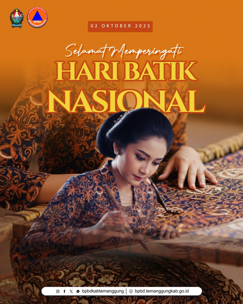 Temanggung, 2 Oktober 2025 — Memperingati Hari Batik Nasional 2025, Badan Penanggulangan Bencana Daerah (BPBD) Kabupaten Temanggung menyampaikan ucapan selamat kepada seluruh masyarakat Indonesia, sekaligus menjadikan momen ini sebagai pengingat pentingnya membangun ketangguhan masyarakat dalam menghadapi bencana.